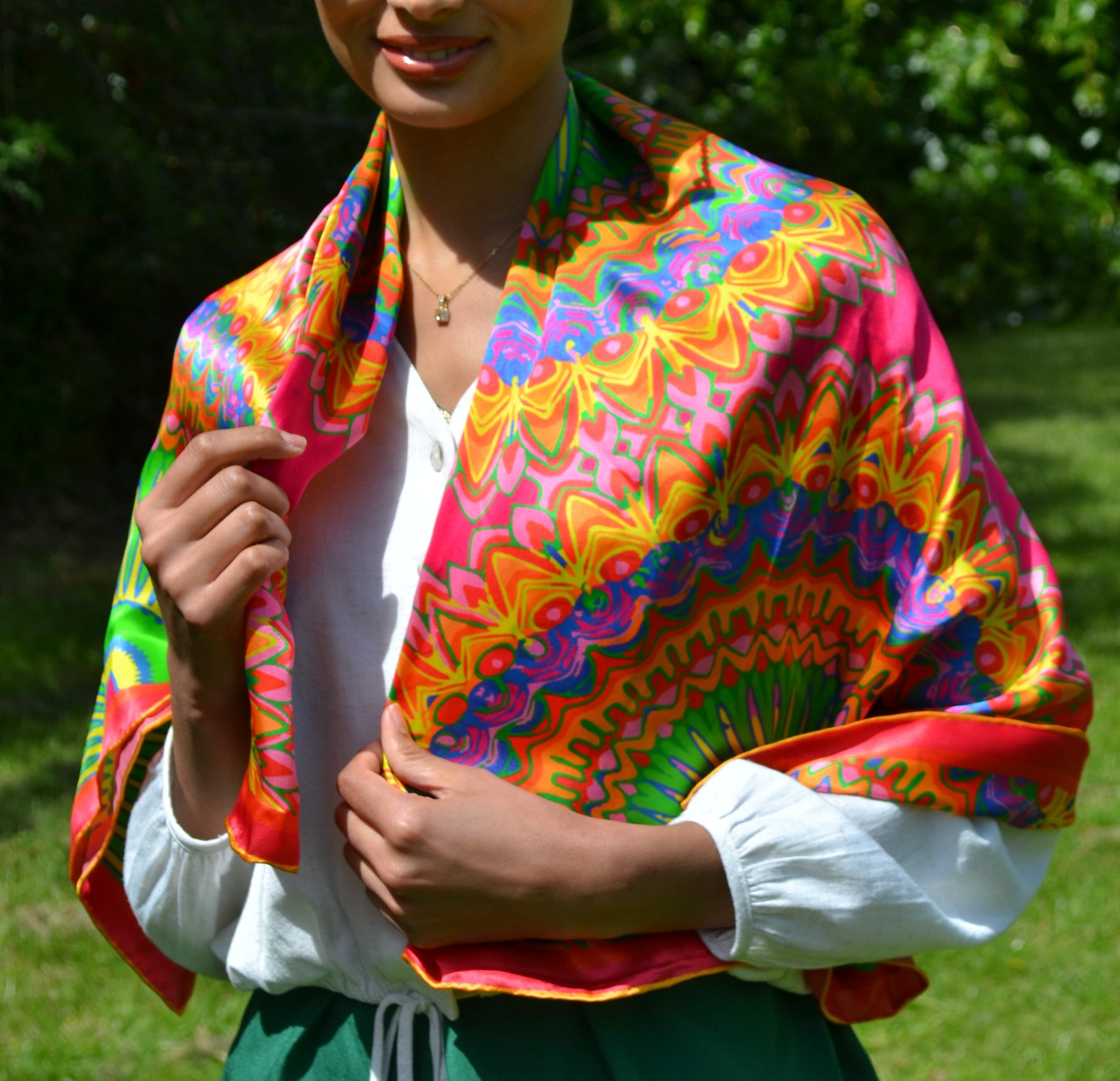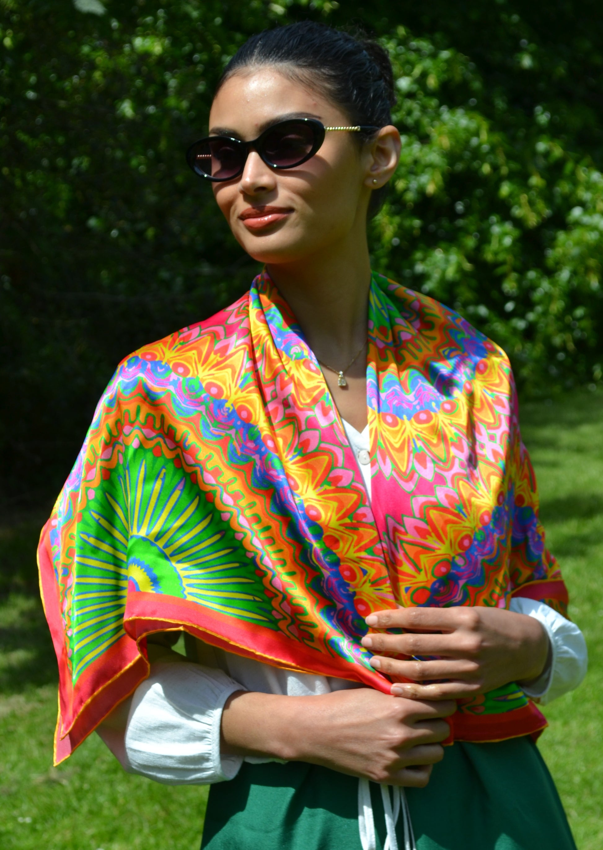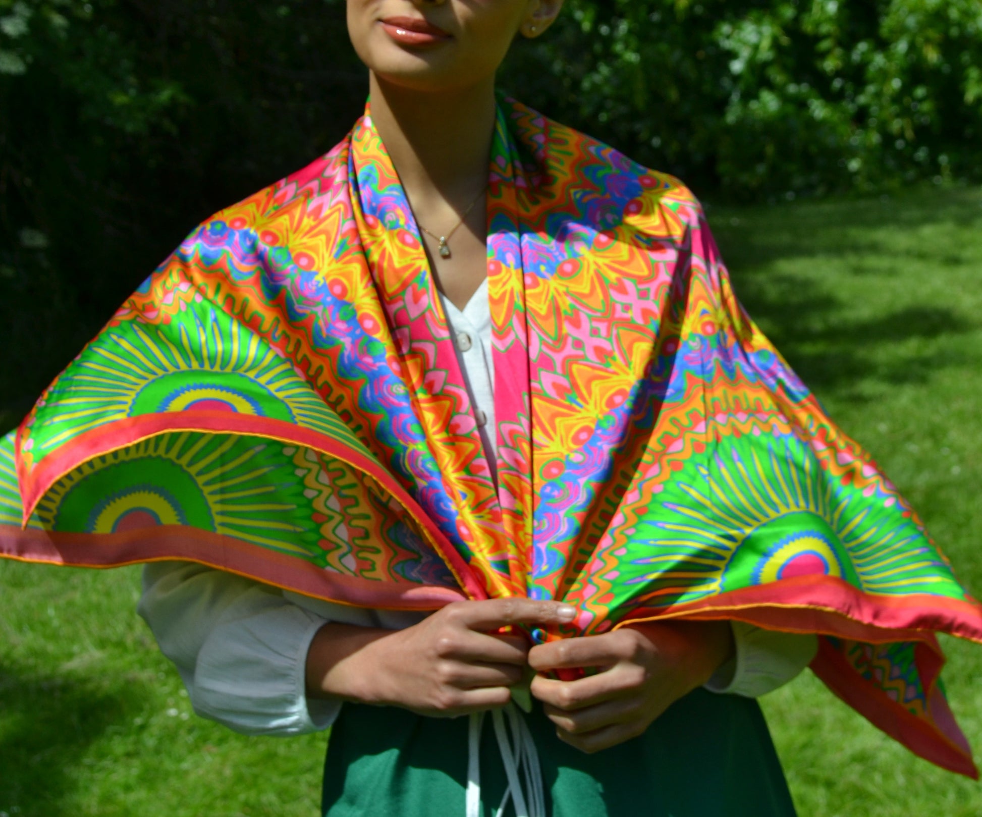 Elevate your style with Amira Dhana’s luxurious silk satin scarves. Each one a wearable work of art. Designed in-house, these statement pieces feature intricate patterns and vibrant colours that bring bold elegance to any look.